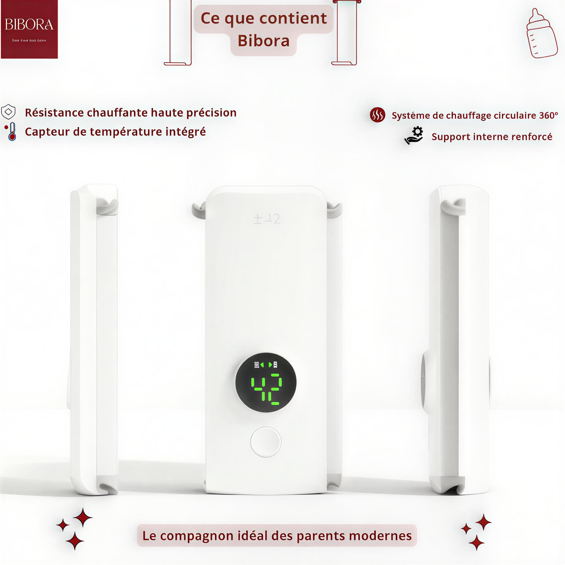 Le chauffe-biberon Bibora réchauffe doucement le biberon grâce à un système de chauffe uniforme et constant. Il suffit de l’enrouler autour du biberon, d’allumer, et de laisser chauffer—sans eau bouillante ni appareil encombrant.